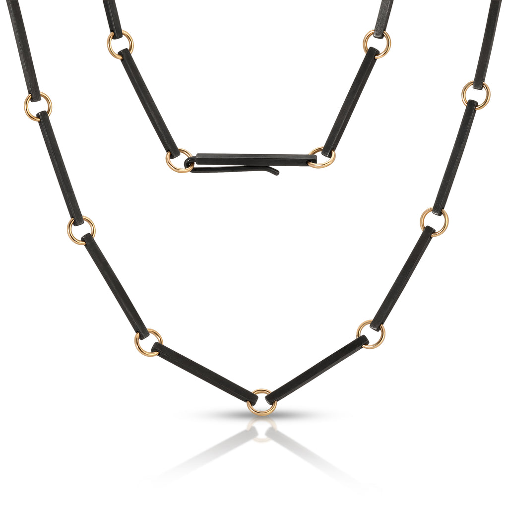This necklace is bold, yet a great base layer for a necklace stack. A spin on the usual chain style, this necklace links are a combination of matte black oxidized silver bars and polished 14k gold round links. 17" long and finished with a hidden hook clasp, it can be adjusted for smaller sizes in 1" increments.