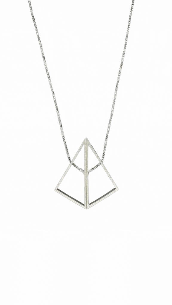 Morph Necklace in brushed sterling silver, made of two triangles joined at the hypotenuse that can rotate to shift the shape from rectangle to kite. Kite shape shown on white background.)