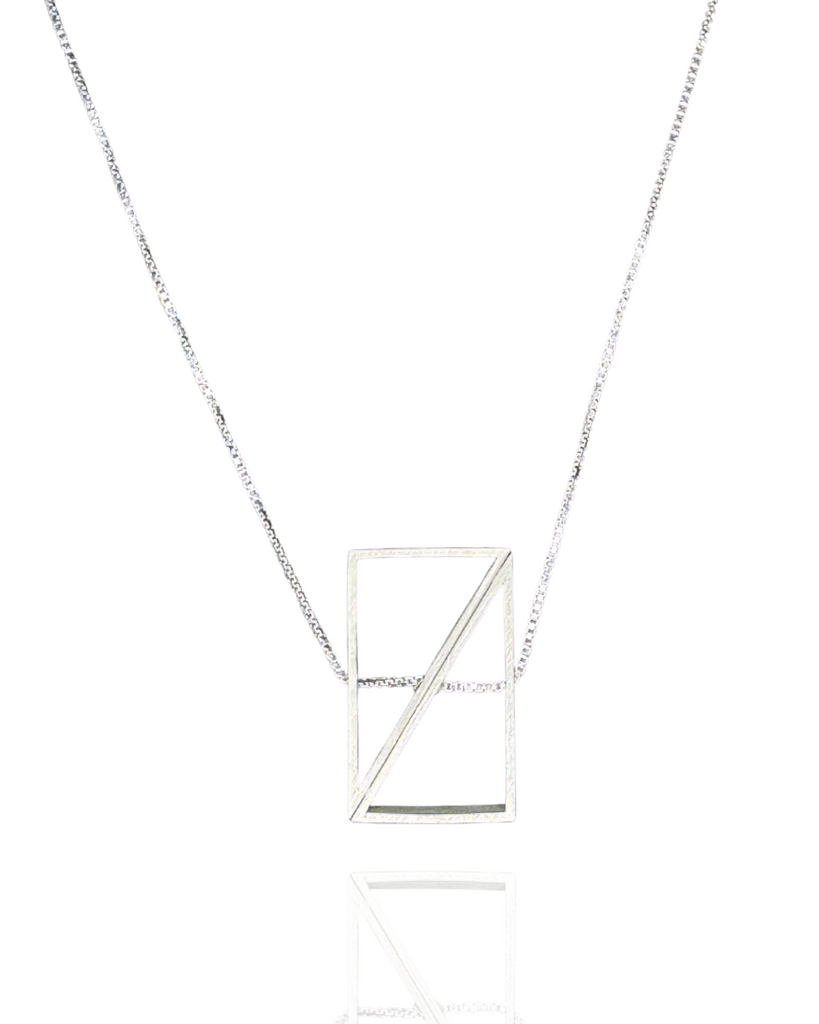 Rectangle Morph Necklace in brushed sterling silver, made of two triangles joined at the hypotenuse that can rotate to shift the shape from rectangle to kite.