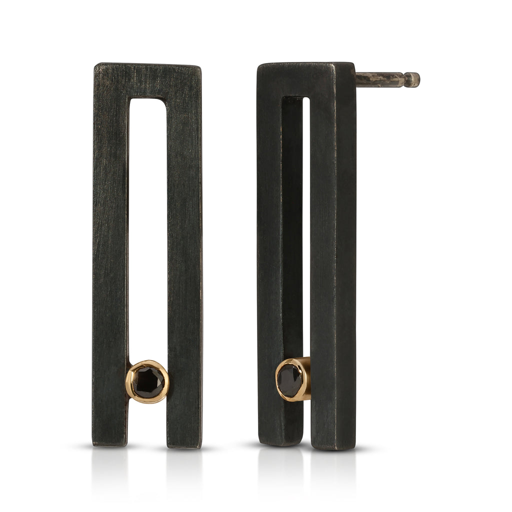 These earrings were inspired by an often seen architecture element, where 2 minimalist buildings exist as a unit, like the Twin Towers or the Brazilian National Congress. The two bars are the front and center of the Twin Earrings and create the sexiest little negative space where a black diamond (heat treated), encased in a 14k gold setting, rests.